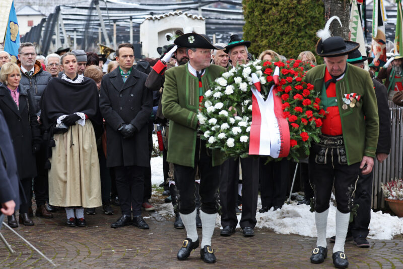Nach der Ehrensalve der Schützenkompanie „Franz Höfler“ Lana und dem Musikstück „Vom guten Kameraden“ endete die Feier mit einer Kranzniederlegung und der Tiroler Landeshymne.