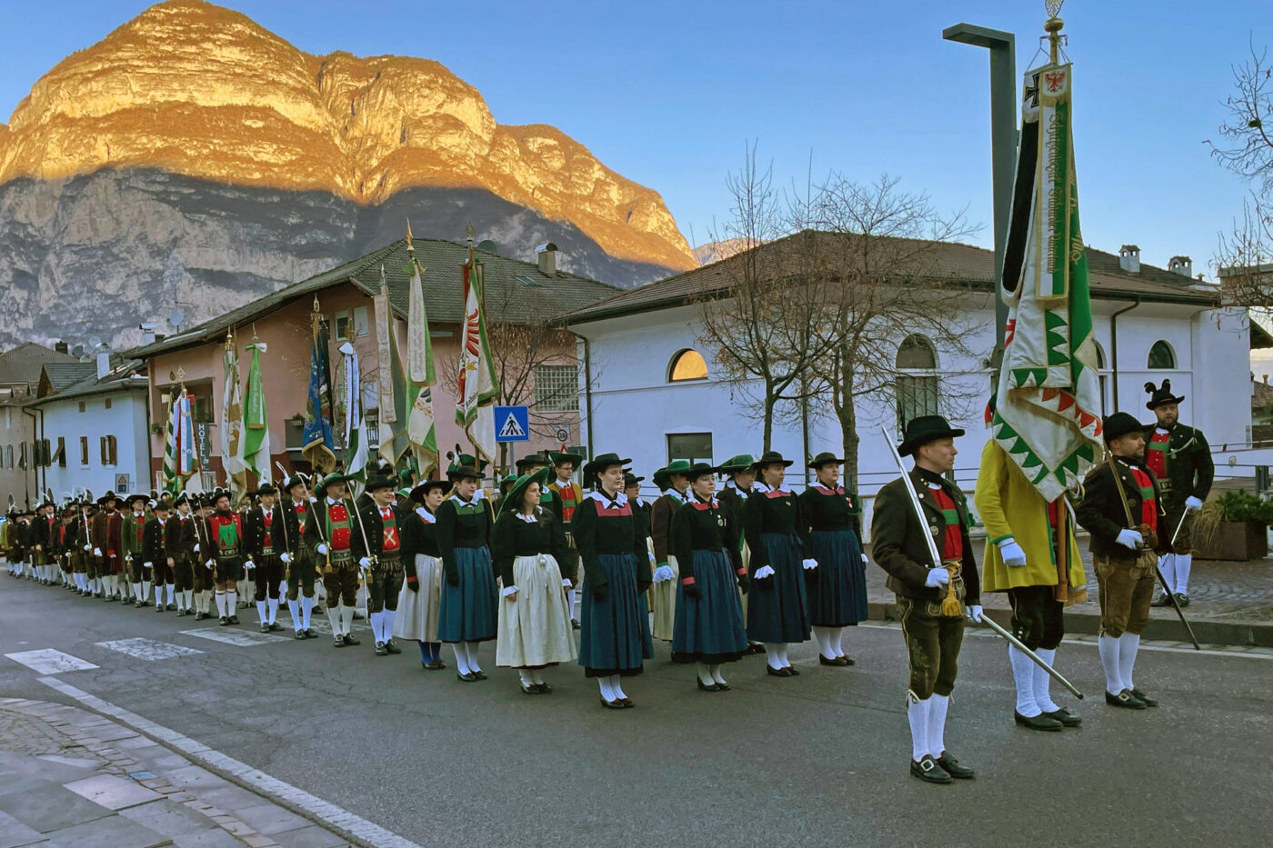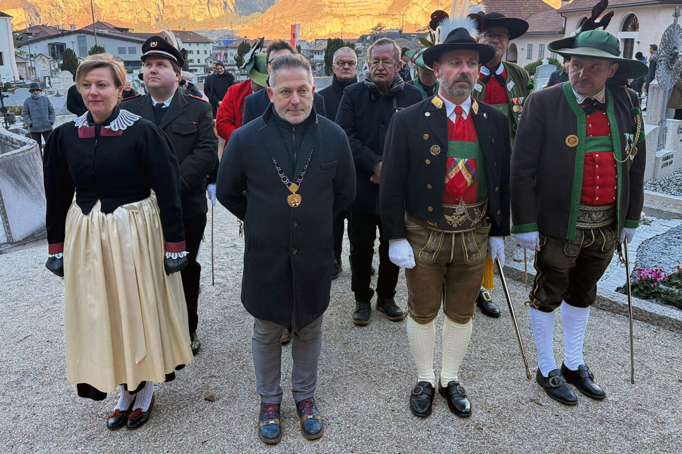 Nach Einmarsch und Feier der heiligen Messe in der Salurner Pfarrkirche, die durch Pfarrer Pierluigi Tosi zelebriert wurde, begrüßte Hauptmann Arno Mall die Anwesenden am Salurner Friedhof, darunter den Salurner Bürgermeister Roland Lazzeri, die deutschen Gemeinderäte Salurns, den Obmann des Südtiroler Heimatbundes Roland Lang, den Ehrenlandeskommandanten Elmar Thaler, Landeskommandant Christoph Schmid, die Bezirksmajore Reinhard Gaiser und Peter Frank, den Obmann des Hauses Noldin, Franz Kosta, den Feuerwehrkommandanten Christopher Nardin sowie die Salurner Bevölkerung und die Schützen aus Südtirol und Welschtirol.