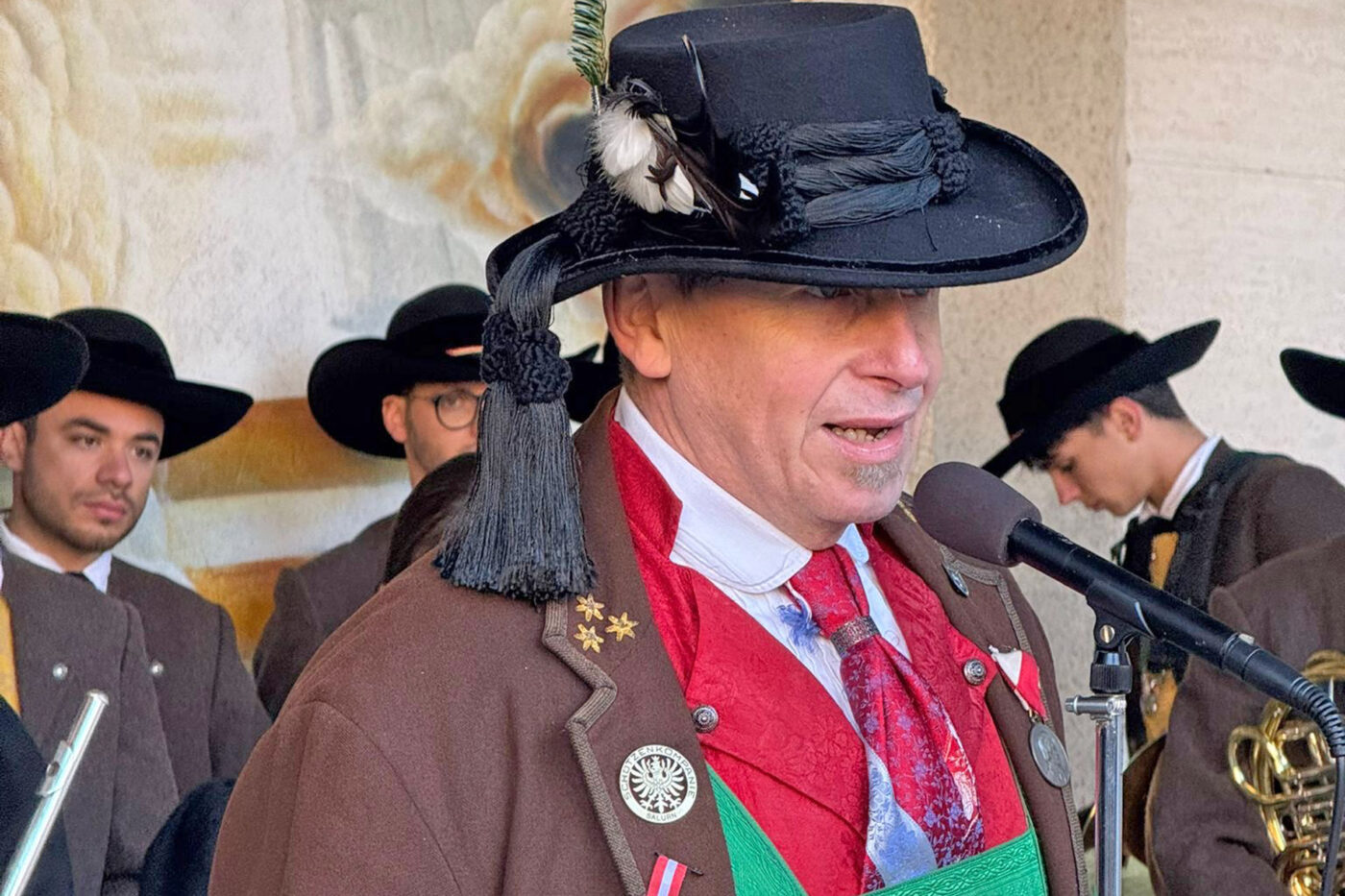 Hauptmann Arno Mall begrüßte die Anwesenden, indem er darauf aufmerksam machte, dass nationalistische Übergriffe gegen Südtiroler Sportler und Politiker auf der Tagesordnung stehen würden und man den Südtirolern durch italienische Medien ständig die Trikolore sowie ein italienisches Bewusstsein aufdrängen würde: