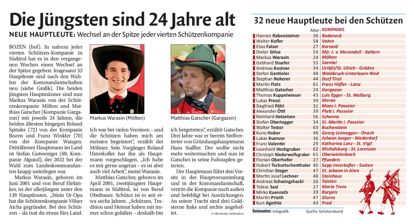 Die jüngsten Hauptmänner sind nun Markus Warasin (24) von der Schützenkompanie Mölten, Matthias Gatscher (24) von der Schützenkompanie Gargazon und Andreas Schwingshackl (25) von der Schützenkompanie Taisten. Die ältesten Hauptmänner stellen derzeit Roland Spitaler (72) von der Schützenkompanie Bozen, Franz Winkler (70) von der Schützenkompanie Wangen und Stefan Gutweniger (69) von der Schützenkompanie Algund.