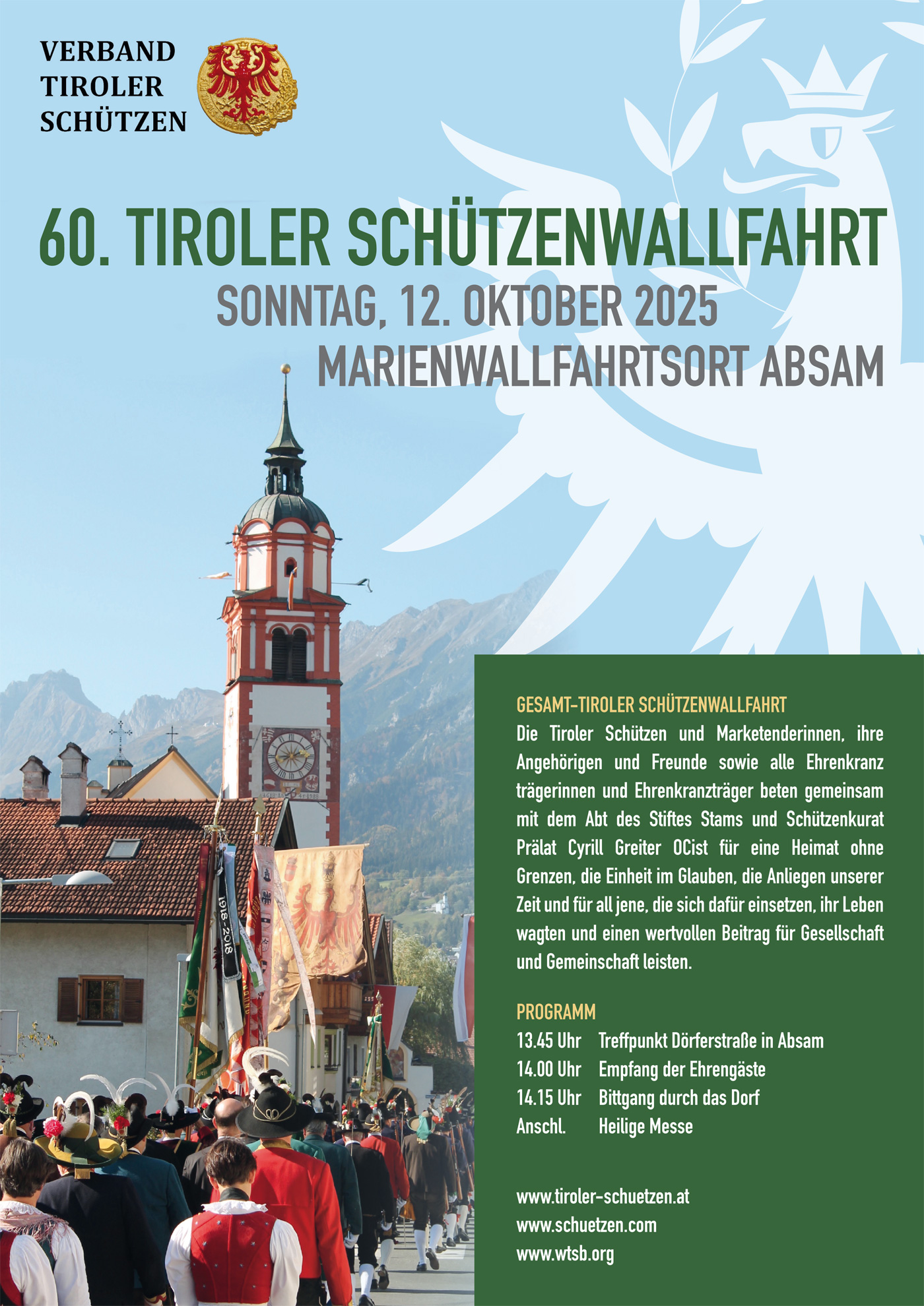 12Okt13:4516:00Tiroler Schützenwallfahrt in AbsamEine Veranstaltung des Verbandes Tiroler Schützen